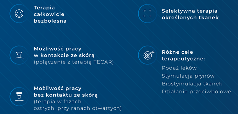 Nieinwazyjna aplikacja leków – umożliwia wprowadzanie substancji czynnych na głębokość nawet 6-7 cm w głąb tkanek, bez igieł i dużo skuteczniej niż sama maść podana na skórę.