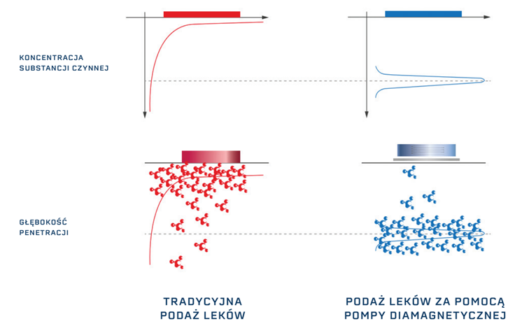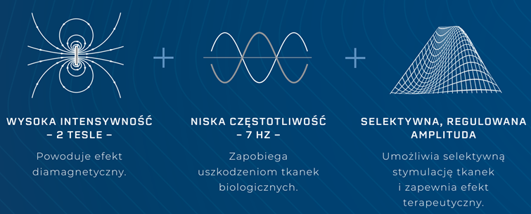 Pompa diamagnetyczna wykorzystuje zjawisko diamagnetyzmu oraz generuje silne, pulsacyjne pole elektromagnetyczne o bardzo wysokiej intensywności. W przeciwieństwie do klasycznych metod, energia jest przekazywana w sposób umożliwiający głęboką penetrację tkanek bez efektu przegrzewania powierzchniowego.